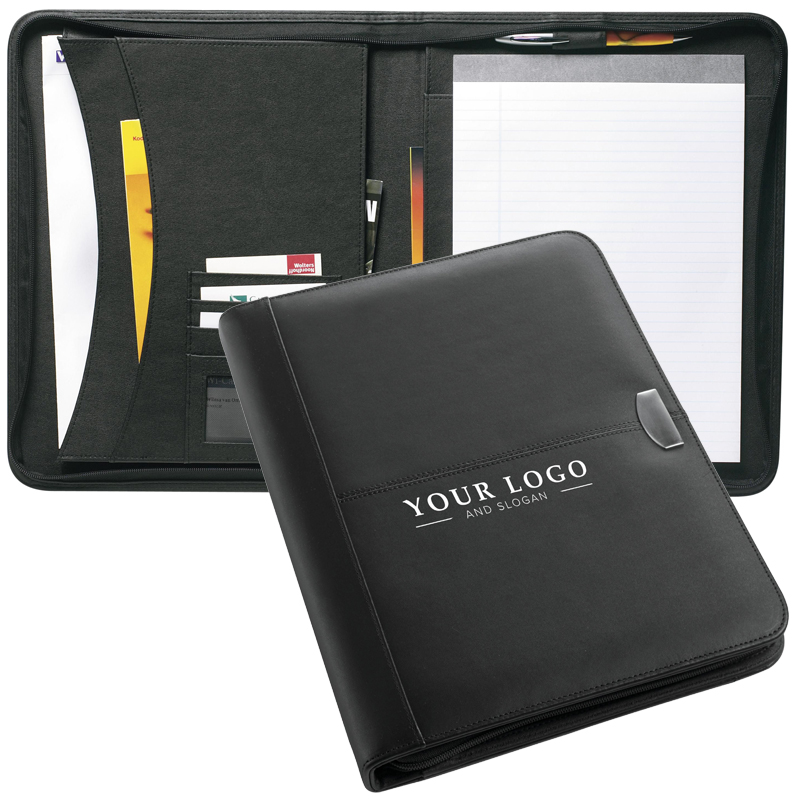 Bonded leather documentenmap (A4), 'Laserline', met ritssluiting, diverse insteekvakken, gelinieerd schrijfblok en metalen graveerplaatje, excl pen.