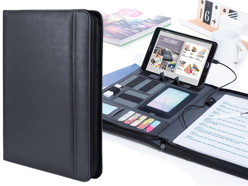 PU lederen documentenmap met 5000 mAh powerbank, 20 vellen notitieblok, mobiele telefoonhouder en tablethouder.