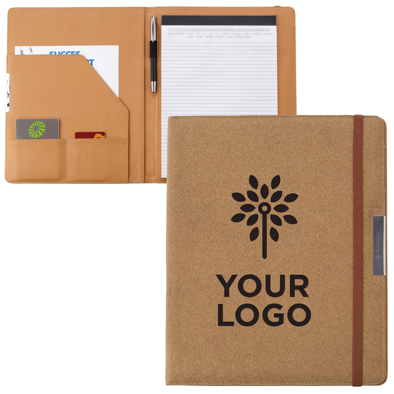 Kurken documentenmap in A4 formaat met rubberen afsluitband, PU binnenzijde met insteekvak voor visitekaartjes, groot insteekvak, notitieblok (circa 20 vel), en een elastieken pennenlus.