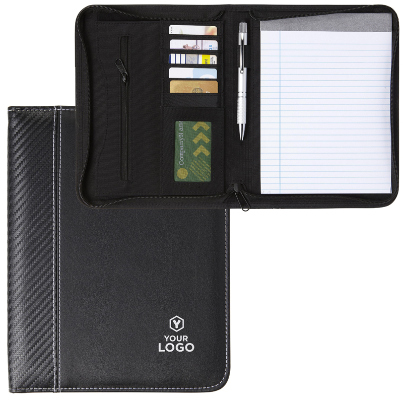 Documentenmap (A5) met PU omslag met ritssluiting, witte stiksels, een elastische penlus, 6 verschillende insteekvakjes, gelinieerd schrijfblok (30 vel) en microfiber lining.
