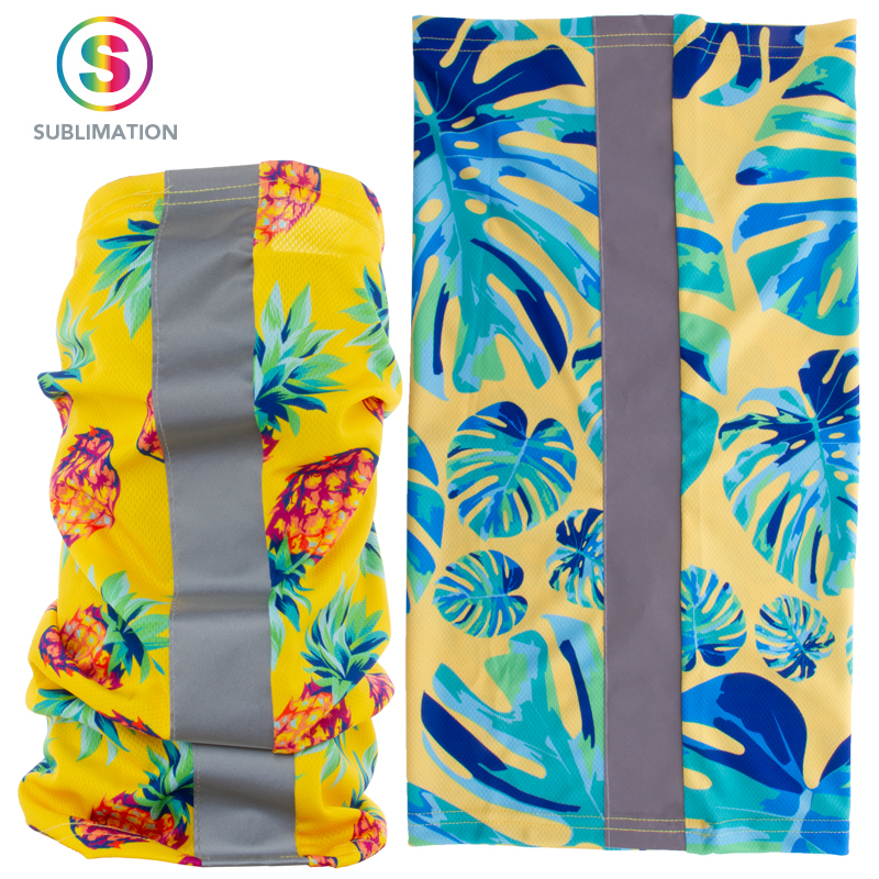 Custom made multifunctionele sjaal van ademend en sneldrogend polyester met reflecterende tape.