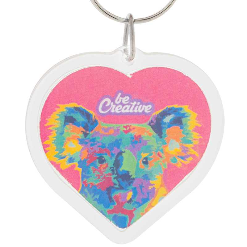 Hartvormige acryl sleutelhanger met op maat gemaakt full colour papieren inzetstuk en metalen ring.
