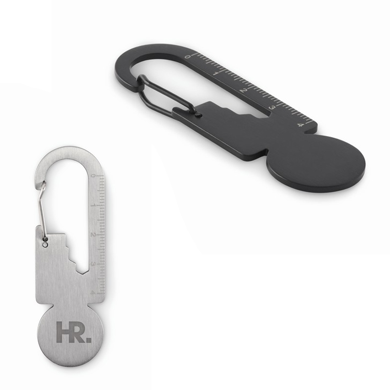 Winkelwagenmuntje met sleutelhanger van gerecycled roestvrij staal (90% gerecycled roestvrij staal en 10% roestvrij staal) met multifunctioneel gereedschap zoals flesopener, liniaal en inbussleutel 5,5mm, 7mm en 8mm.