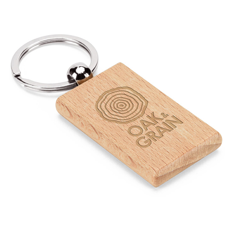 Rechthoekige sleutelhanger van beukenhout met ijzeren ring.