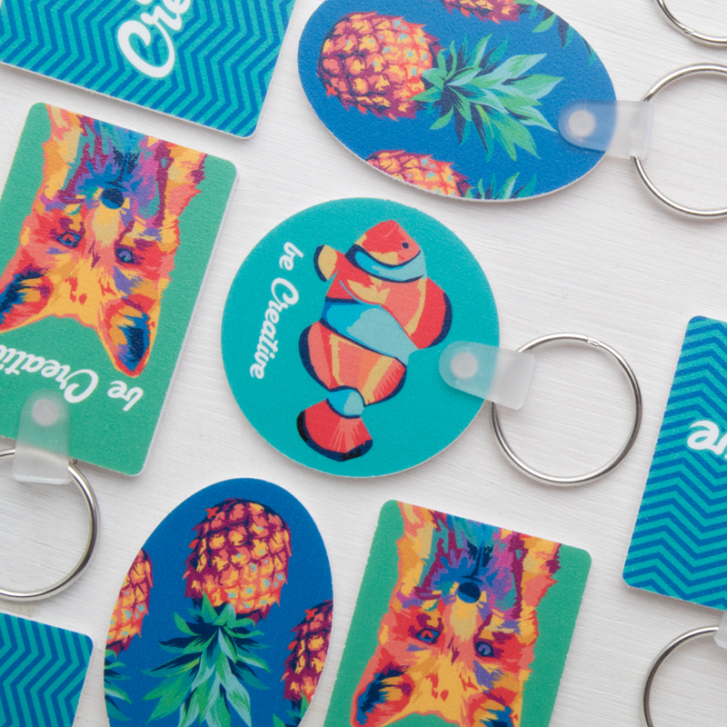 Ronde sleutelhanger van PVC–schuim met full colour bedrukking.