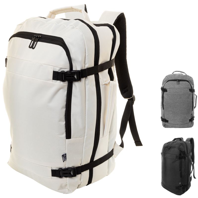 RPET-rugzak en documententas met dubbele functie met 2 compartimenten met ritssluiting, voorvak met rits en gewatteerd laptopvak (15").