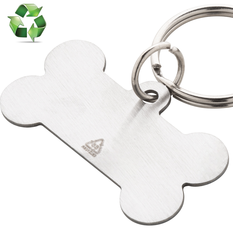 Botvormige, gerecyclede roestvrijstalen hondenpenning met sleutelhanger.