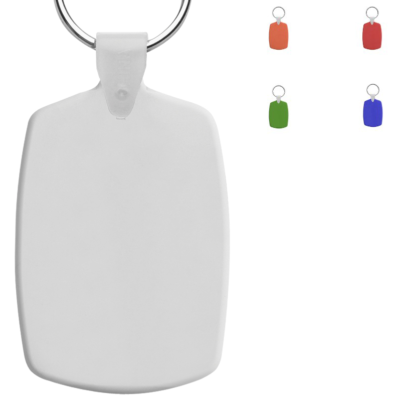 Rechthoekige plastic sleutelhanger met metalen ring.