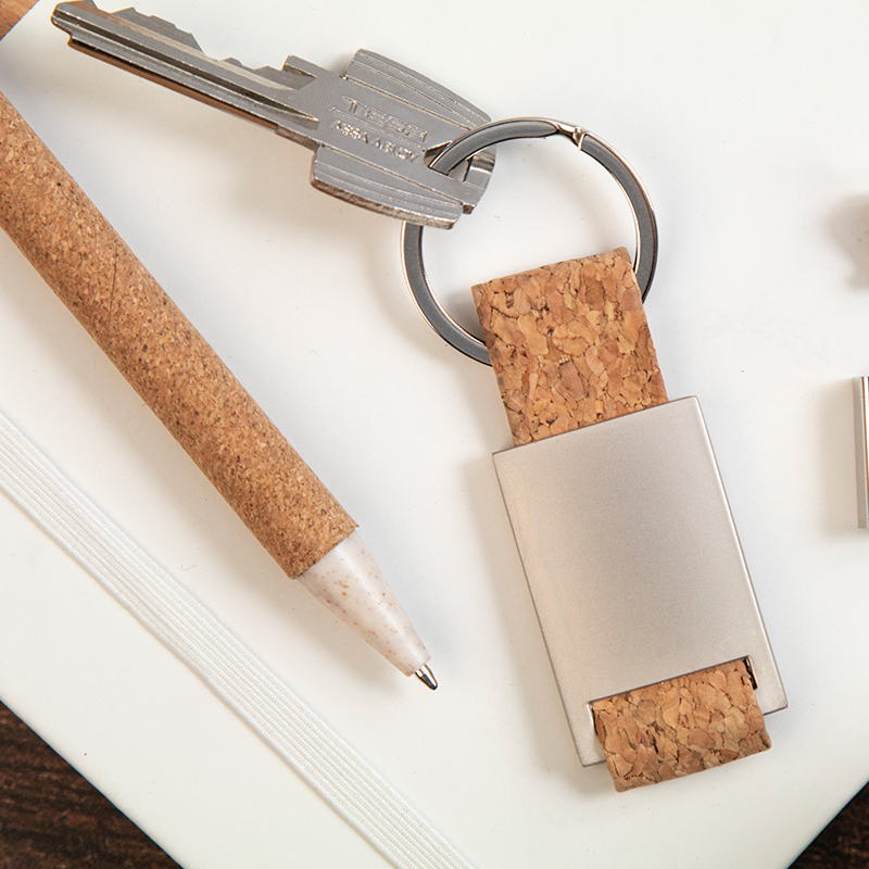 Rechthoekige metalen sleutelhanger met bandje van natuurkurk en metalen ring.