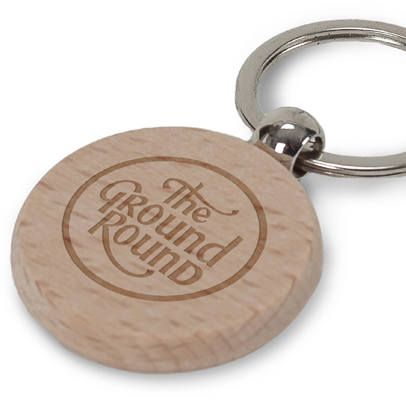 Ronde sleutelhanger met houten plaatje voor een natuurlijke uitstraling.