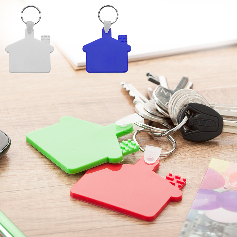 Plastic sleutelhanger in de vorm van een huis met metalen ring.