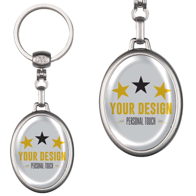 Metalen ovale sleutelhanger, mat zilver met ring.