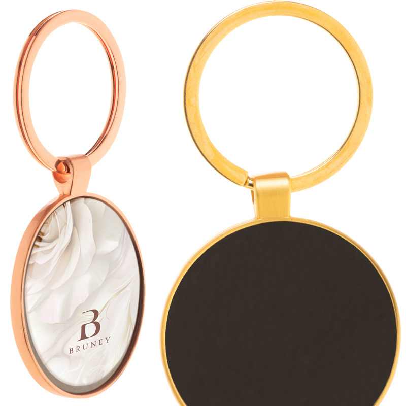 Ronde metalen sleutelhanger met gouden afwerking en bronskleurige plaat.