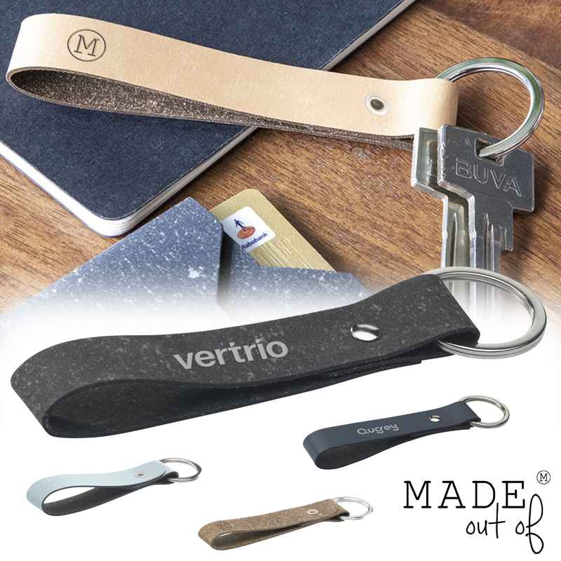 Sleutelhanger gemaakt van gerecycled leerafval (van leer afkomstig uit Italië) en natuurlijke binders.