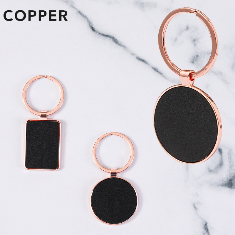 Verfijnde metalen sleutelhanger met gegalvaniseerde koperlaag en een glanzende afwerking.