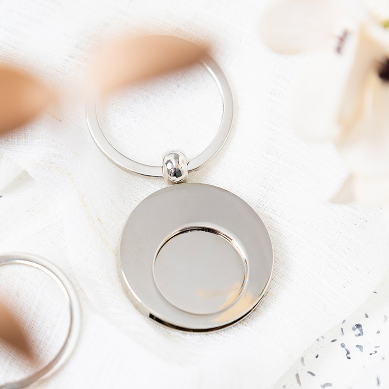 Ronde metalen sleutelhanger met winkelwagenmunt.