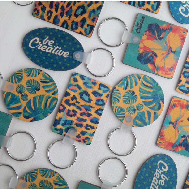 Vierkante, gelamineerde berkenhouten sleutelhanger met full colour bedrukking.