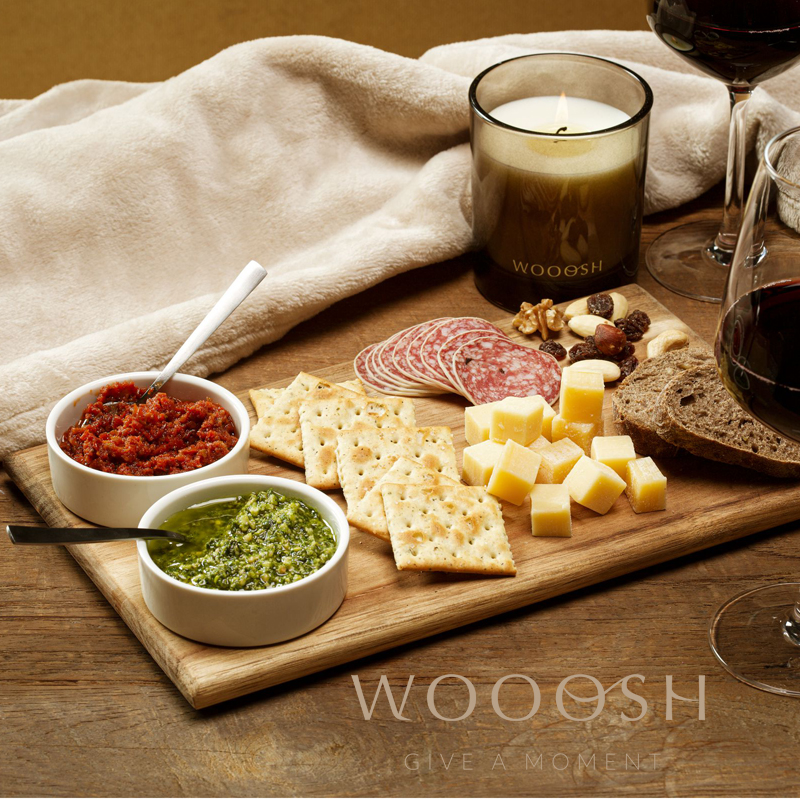 Deze Wooosh serveerplank met 2 porseleinen schaaltjes is een aangename eyecatcher op je tafel.