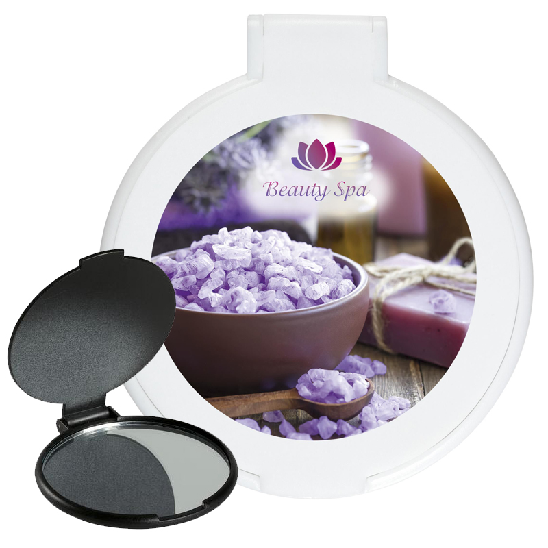Spiegeltje in kunststof houder met beschermklepje.
