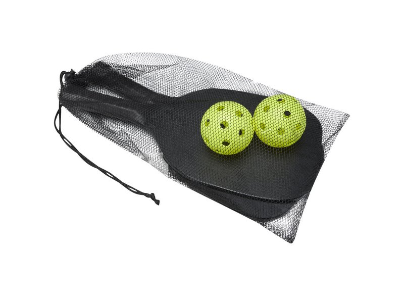 De set is compleet met 2 ballen van PP-materiaal en is verpakt in een opbergzak van mesh-polyester met een afmeting van 45 x 26 cm.