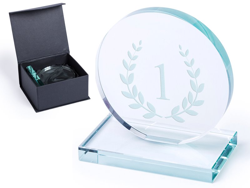 Dikke, glazen trofee met elegant rond ontwerp en vierkante standaard.