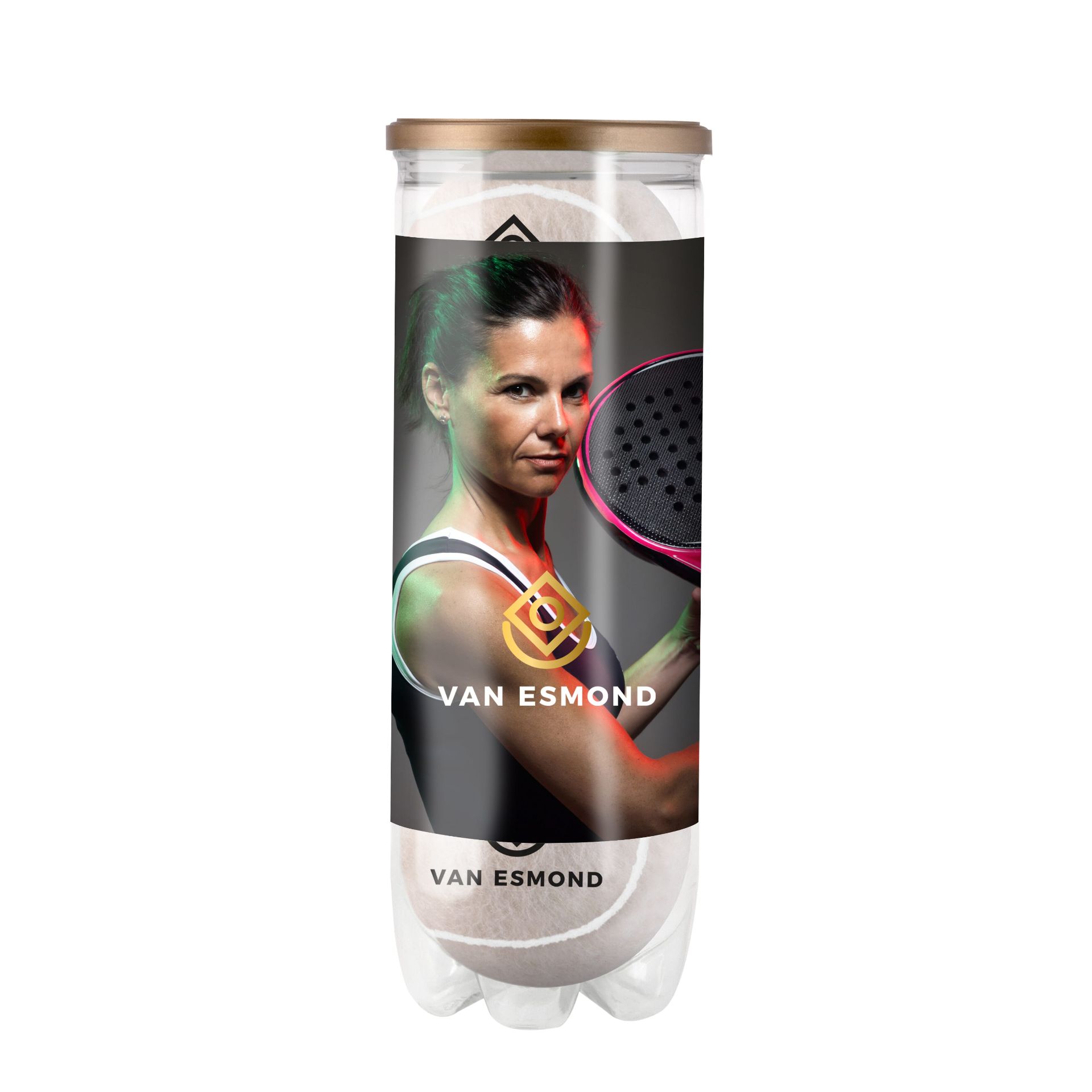 Een transparante koker met 3 drukloze padelballen met een full colour bedrukking en een full colour bedrukt etiket rondom.