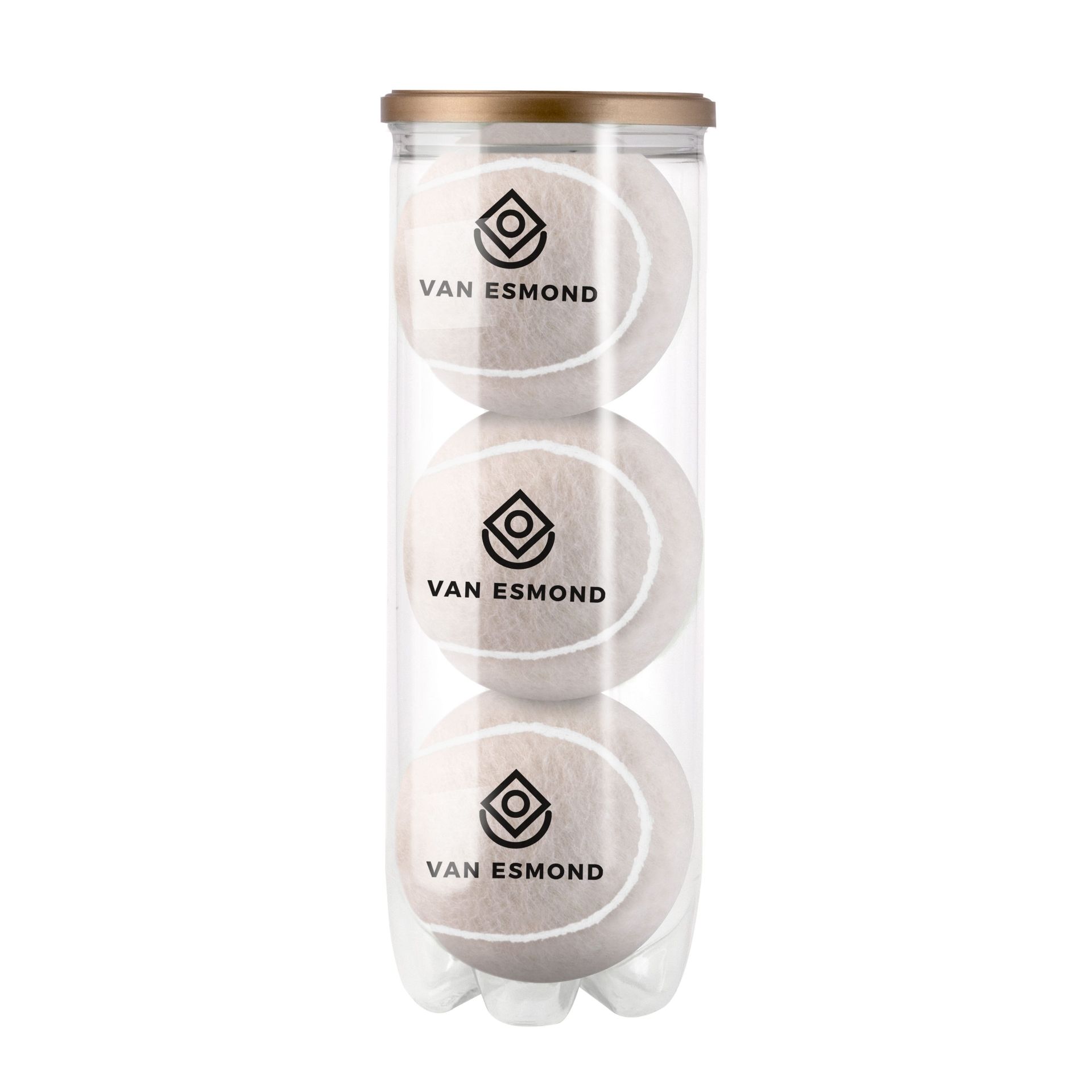 Een transparante koker met 3 drukloze padelballen met een full colour bedrukking.