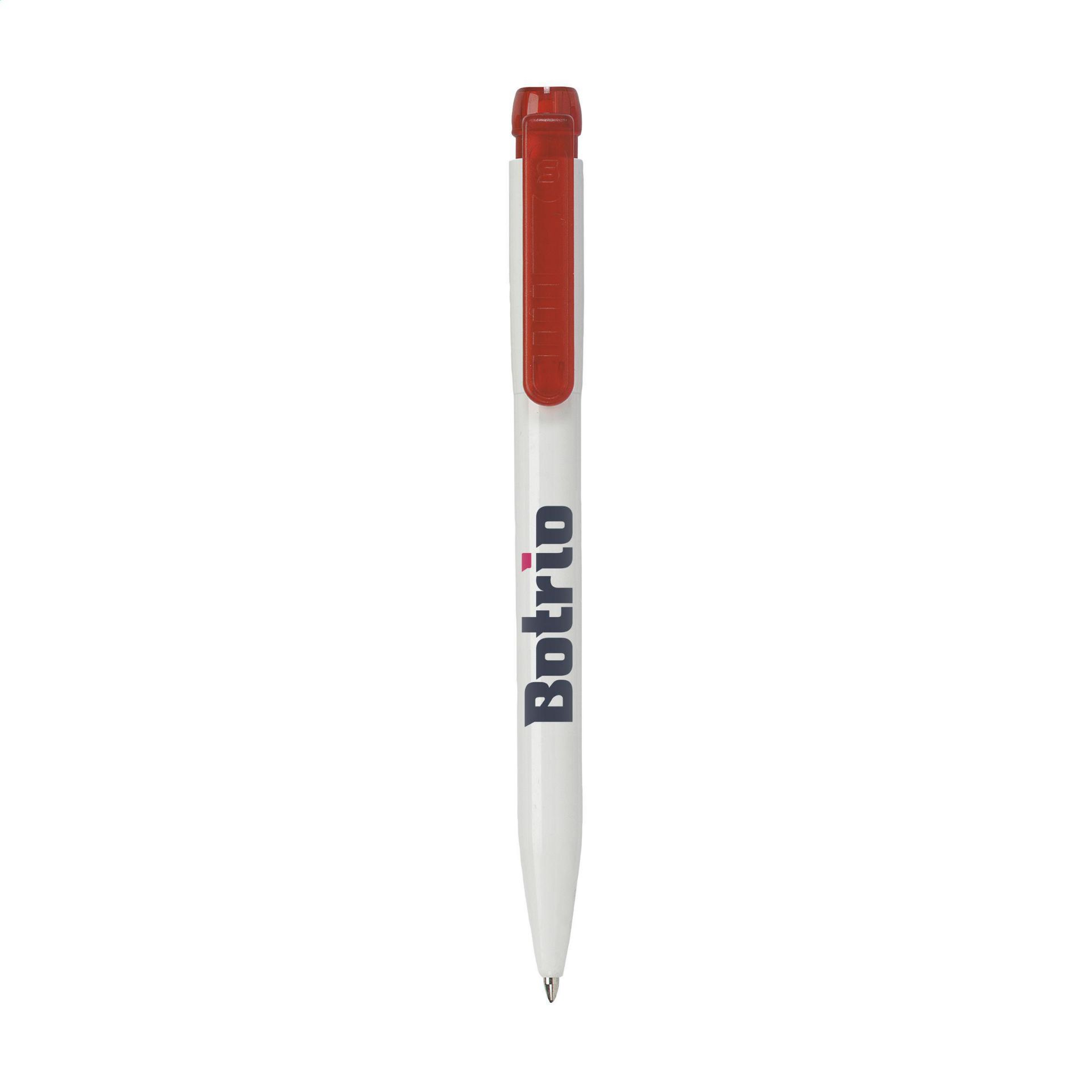 Blauwschrijvende balpen met transparantgekleurde clip/drukknop.