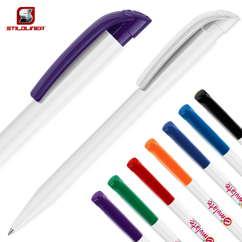 Balpen van het merk Stilolinea, met blauwschrijvende vulling en gekleurde clip/drukknop.