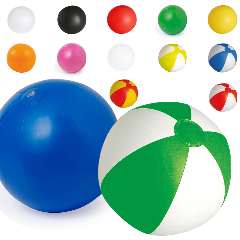 Opblaasbare strandbal van PVC materiaal in gevarieerde kleuren.