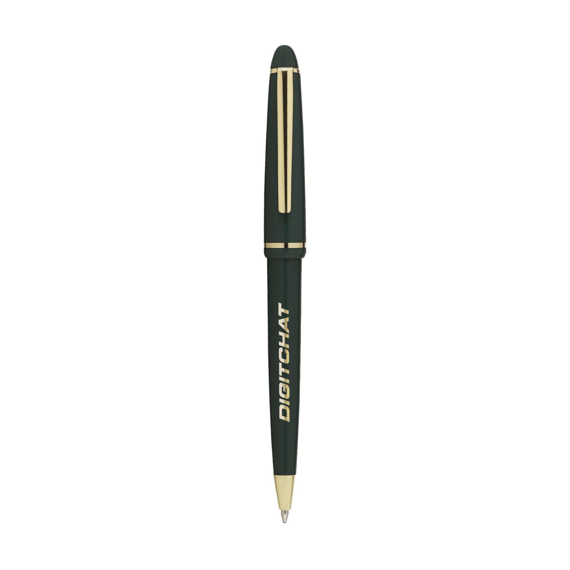 Blauwschrijvende balpen met gepolijste houder, vergulde, sierlijke clip en puntstuk en schuifkapdruksysteem.