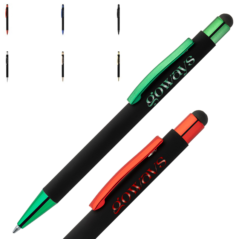 Gerecycleerde aluminium touchscreen-balpen met zwarte rubberen behuizing en gekleurde glanzende metalen afwerkingsonderdelen.
