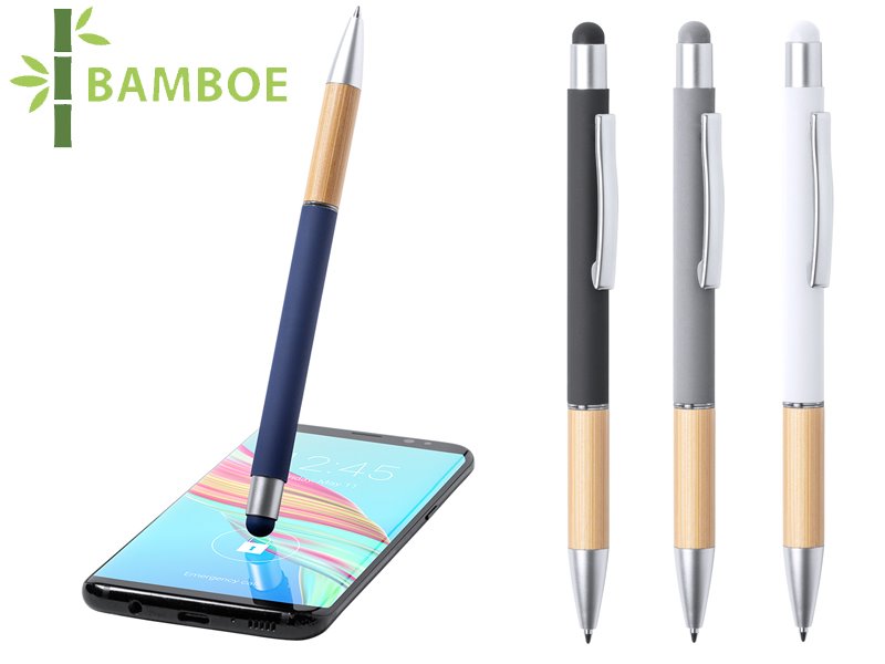 Aluminium balpen en touch screen pen met bamboe grip en matte afwerking.