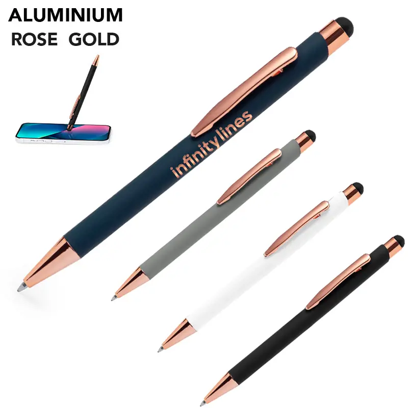 Rubberen balpen speciaal ontworpen voor lasermarkeren met rosékleurig logo.