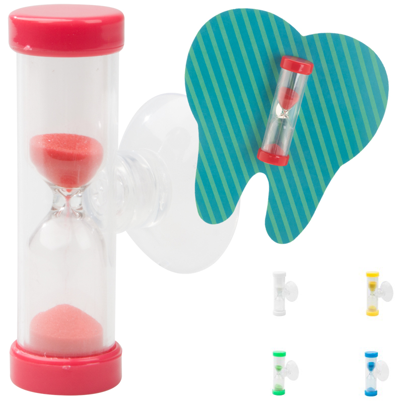 Plastic zandloper voor drie minuten, met bijpassend gekleurd zand en zuignap.