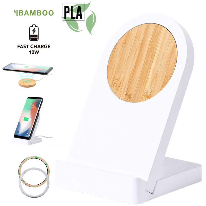 Draadloze oplader gemaakt van bamboe, en behuizing in PLA -Poly Lactic Acid-, dat wordt verkregen uit 100% natuurlijke grondstoffen zoals maïszetmeel, yucca of suikerriet, in staat om 100% composteerbaar te worden aan het einde van zij