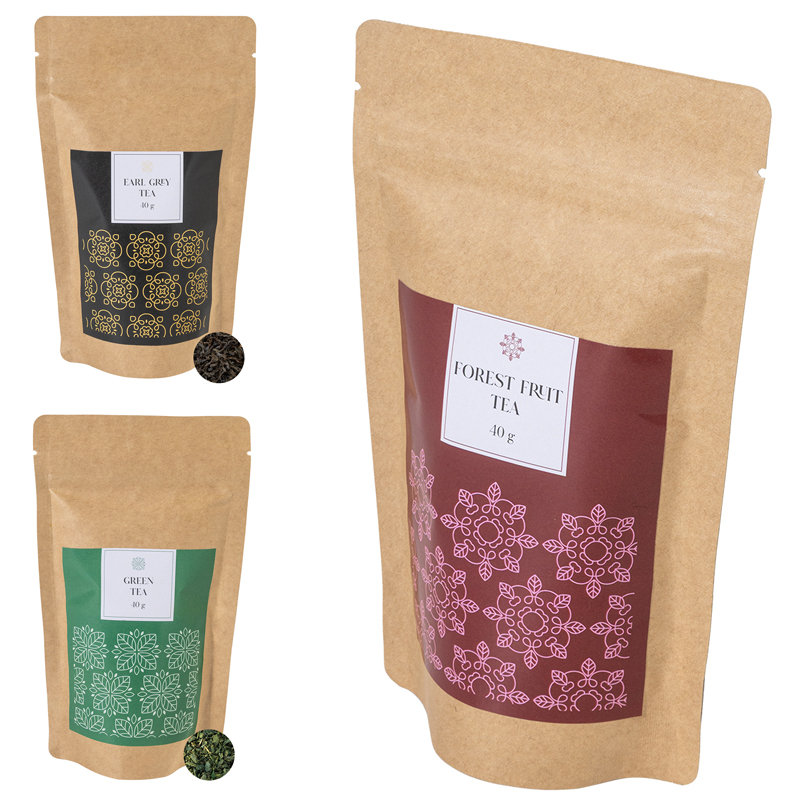 Losse bladthee verpakt in een natuurlijke kraft papieren zak.