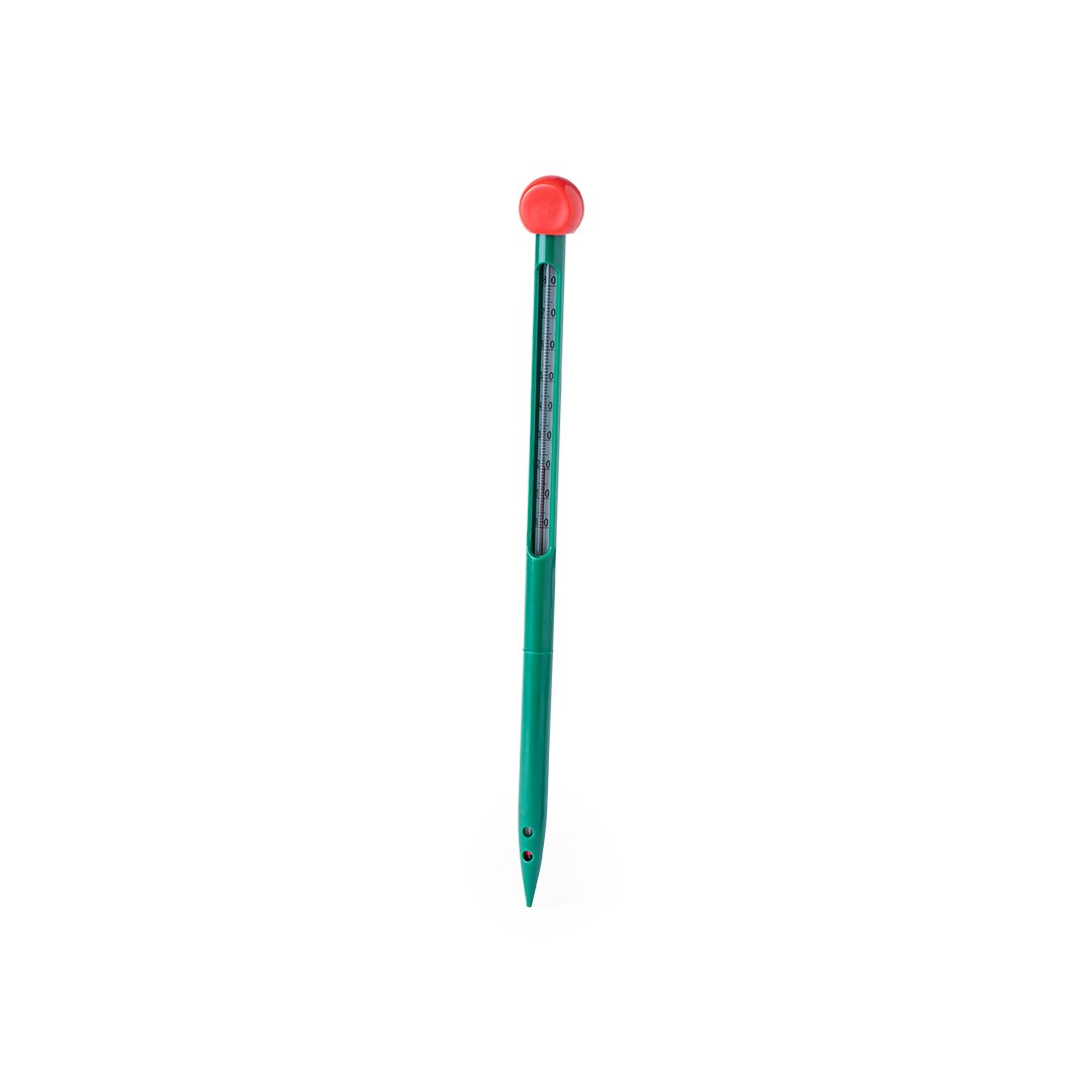 Met een meetsonde om in de grond te steken (6 cm is voldoende) en een analoge afleesschaal.