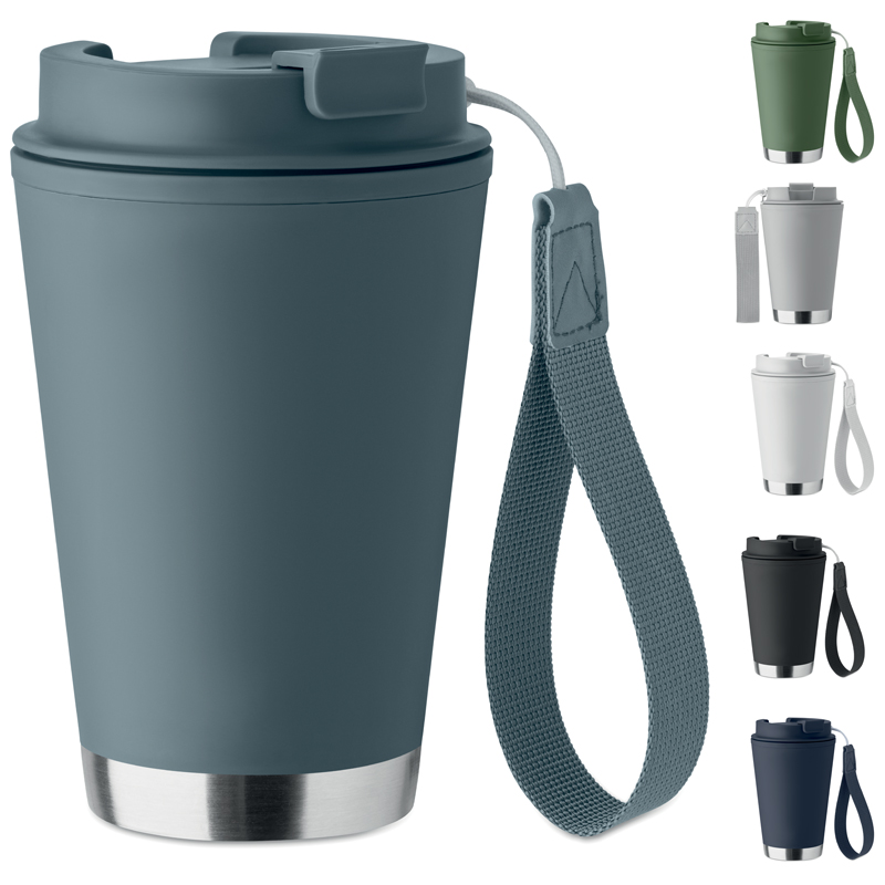 Dubbelwandige beker met PP binnenwand, gerecycled PP buitenwand, gerecycled roestvrijstalen detail en RPET polsband.