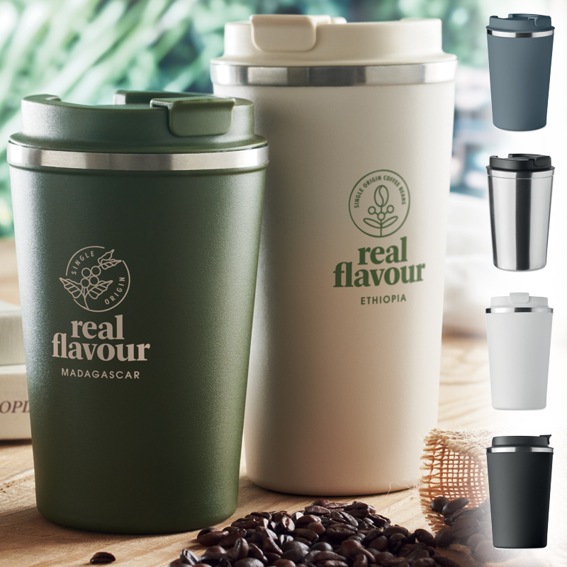 Dubbelwandige RVS drinkbeker met PP kunststof deksel.