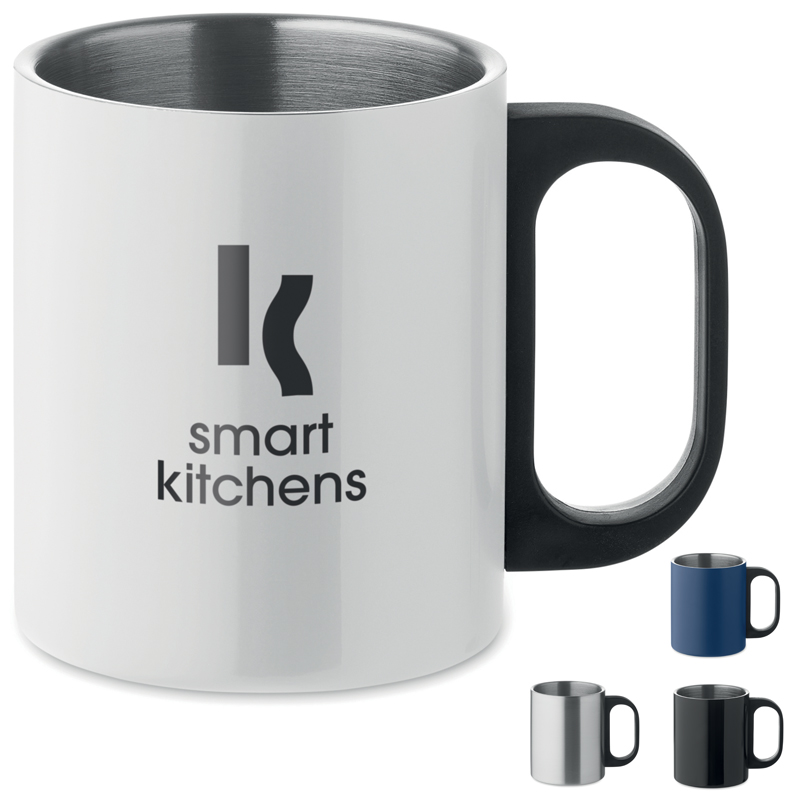 Dubbelwandige roestvrijstalen mok met PP handvat.