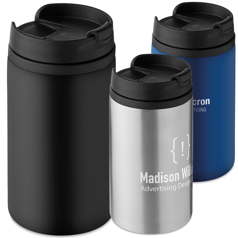 Dubbelwandige roestvrijstalen beker met dop en PP binnenzijde.
