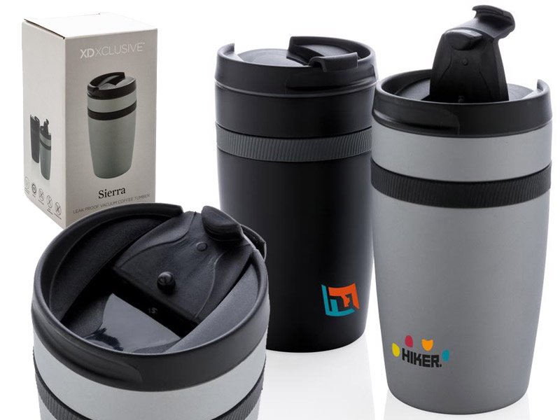Vacuüm geïsoleerde dubbelwandige roestvrijstalen design koffie beker met siliconen band detail.