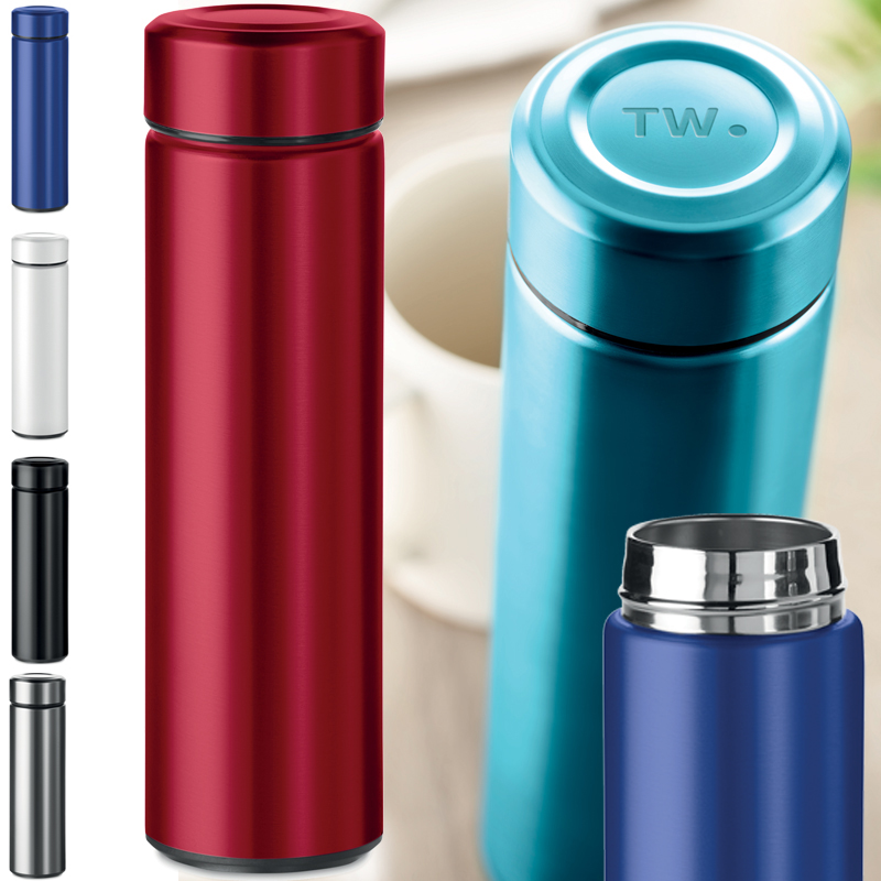 Dubbelwandige vacuüm geïsoleerde RVS drinkfles met uitneembare theezeef.