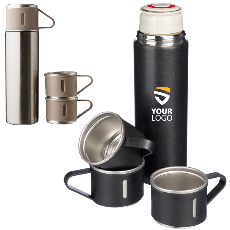 Roestvrijstalen (s/s304) dubbelwandige flessenset (420 ml) inclusief twee bekers (150 ml), samen verpakt in een bruine kartonnen doos.
