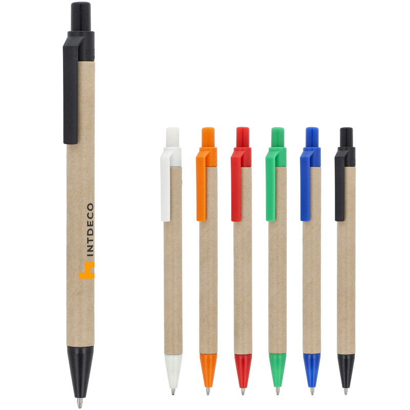 Balpen van papier met gekleurde kunststof onderdelen van gerecycled materiaal.