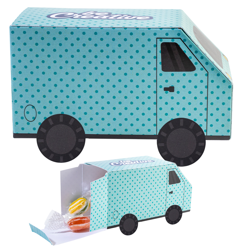 Custom made, vrachtwagenvormige snoepdispenserdoos met full colour bedrukking.