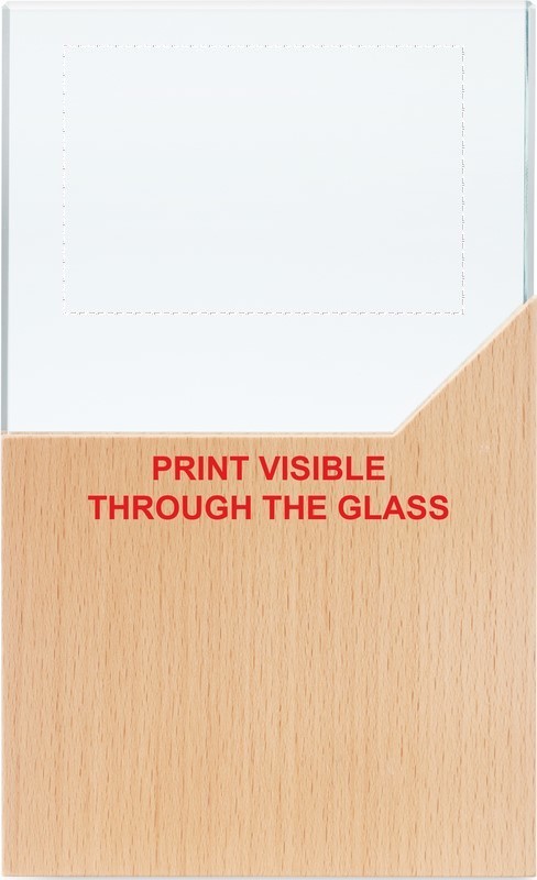 Kristallen award of gedenkplaat op een beukenhouten basis in een geschenkdoos.