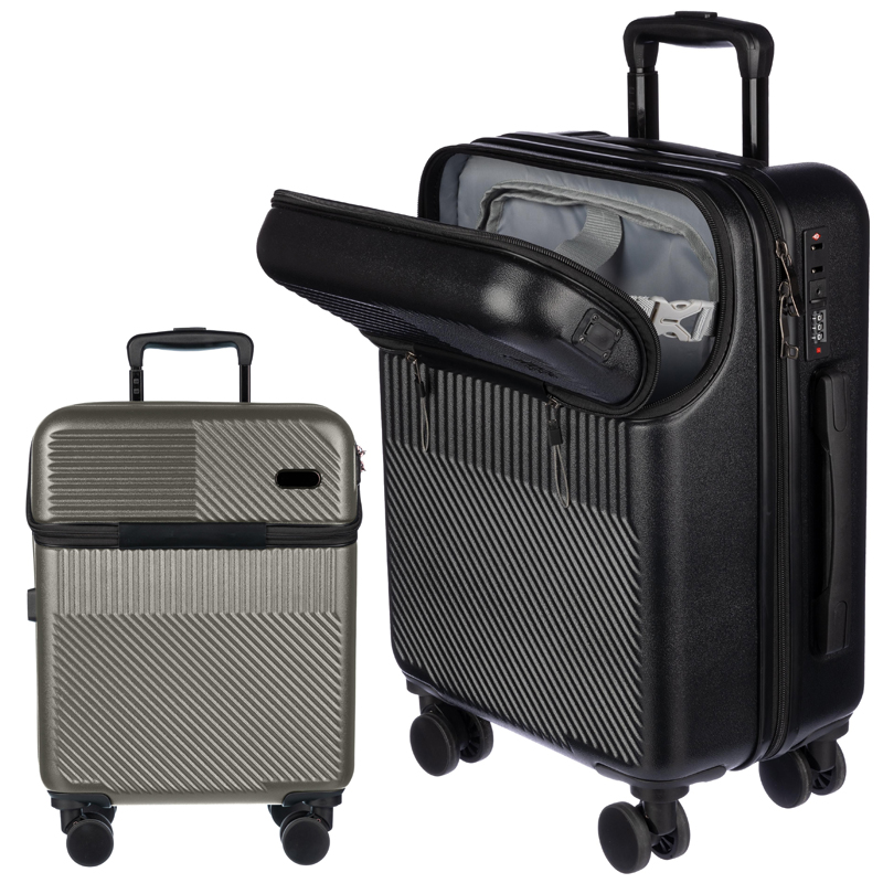 ABS bagagetrolley met voorste ritsvak voor laptop, 8 wielen en drie standen handgreepsysteem.