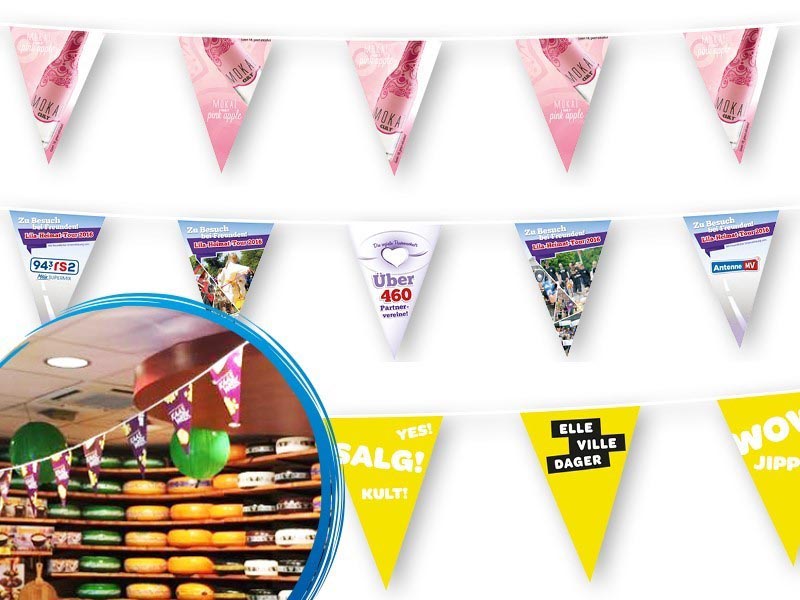 Met een minimumafname van 50 stuks (indien u kleinere oplages wenst, vraag ons vrijblijvend info). Wimpellijn 5 meter kan ook digitaal vanaf 1 stuk gedrukt worden, vraag bij ons verkoopteam een offerte aan.